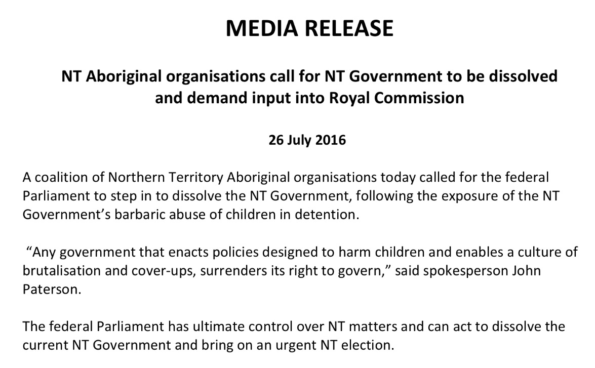 A coalition of Northern Territory Aboriginal organisations today called for the federal Parliament to step in to dissolve the NT Government, following the exposure of the NT Government’s barbaric abuse of children in detention.